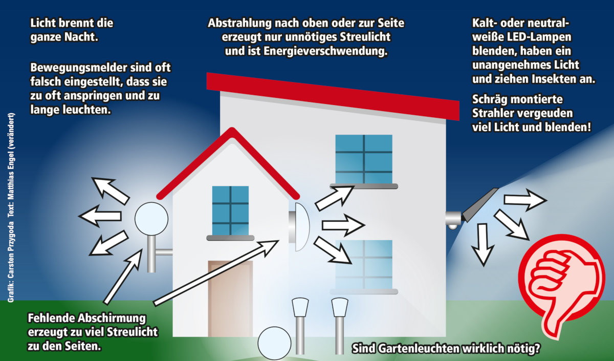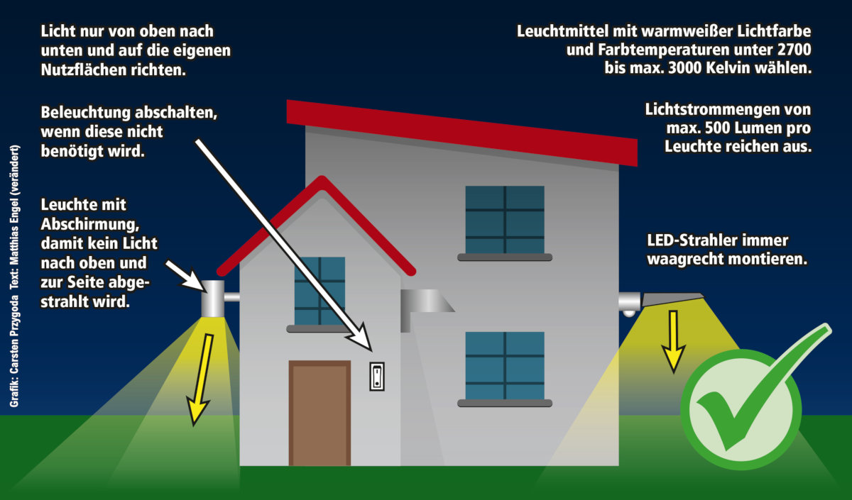Auch im privaten Bereich kann jeder Hausbesitzer etwas gegen die zunehmende Lichtverschmutzung tun. Folgende Grafiken zeigen im Vergleich die Nutzung herkömmlicher Beleuchtung und die Optimierungsmöglichkeiten zur Verhinderung von unnötigen Lichtimmissionen durch richtige Einstellung von Bewegungsmeldern, durch z.B. waagerechte Montage von LED Strahlern und durch den Kauf von speziellen Lampentypen die durch Abschirmung das Licht nur nach unten strahlen lassen. Nun muss nur noch das richtige Leuchtmittel ausgewählt werden. Dabei helfen die Angaben auf der Verpackung. Hinsichtlich der Lichtleistung sollte bedarfsorientiert entschieden werden. Dabei gilt, je geringer die Watt- oder Lumenzahl desto höher die Energieeinsparung und desto geringer die Lichtverschmutzung. Die Farbtemperatur sollte möglichst kleiner als 3000 Kelvin (warmweiß) betragen.