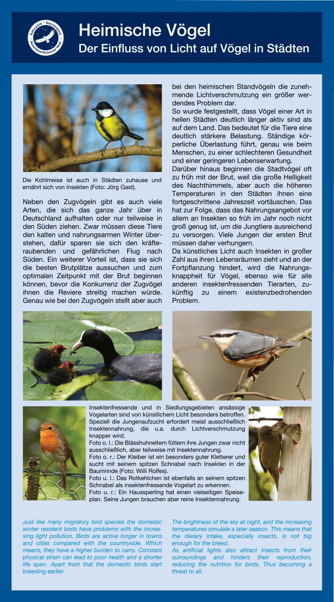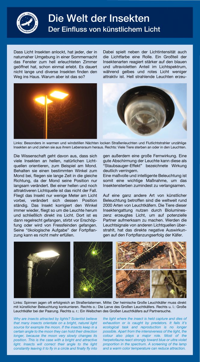 Nicht nur wir Menschen sind einem Tag-Nacht-Rhythmus unterworfen, sondern auch die Tiere und Pflanzen. Rund 30 Prozent aller Wirbeltiere und mehr als 60 Prozent aller Wirbellosen nutzen die Nacht als „Lebensraum“. Hier wird gejagt, sich fortgepflanzt und bestäubt. Zu viel künstliche Beleuchtung in der Stadt während der Nacht stört den Tag-Nacht-Rhythmus z.B. einheimischer Vogelarten empfindlich. Ihre Aktivitätszeit verlängert sich, was dauerhaft zu einer Belastung und schlechterem Gesundheitszustand führt. Nicht nur das, für Insekten wird die Straßenlaterne oft zu einer Todesfalle, für die geheimnisvollen Flieger der Nacht, den Fledermäusen, kann Licht zu einer undurchdringlichen Barriere werden und für Zugvögel birgt es die Gefahr einer Fehlorientierung auf ihrem Weg in den warmen Süden. Erfahren Sie hier weitere spannende Aspekte über die Lebensweise von Vögeln, Insekten und Fledermäusen und den Einfluss bzw. die Gefahr von künstlichem Licht auf diese nachtaktiven Tiere.