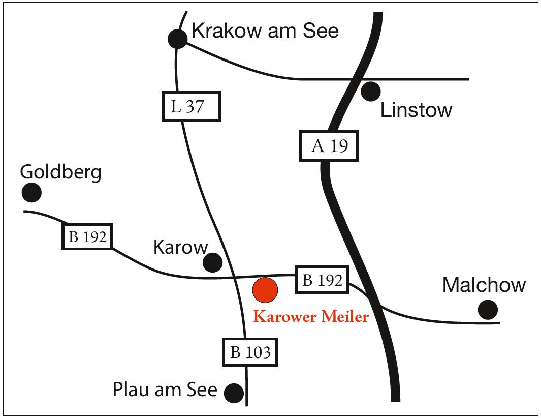 bis zum Bahnhof Karow, dann 1,5 km dem straßenbegleitenden Radweg in Richtung Plau bis zur Ampelkreuzung folgen, hier nach links abbiegen (B192 Richtung Malchow), nach 200 m befindet sich der Karower Meiler rechts an der Straße.